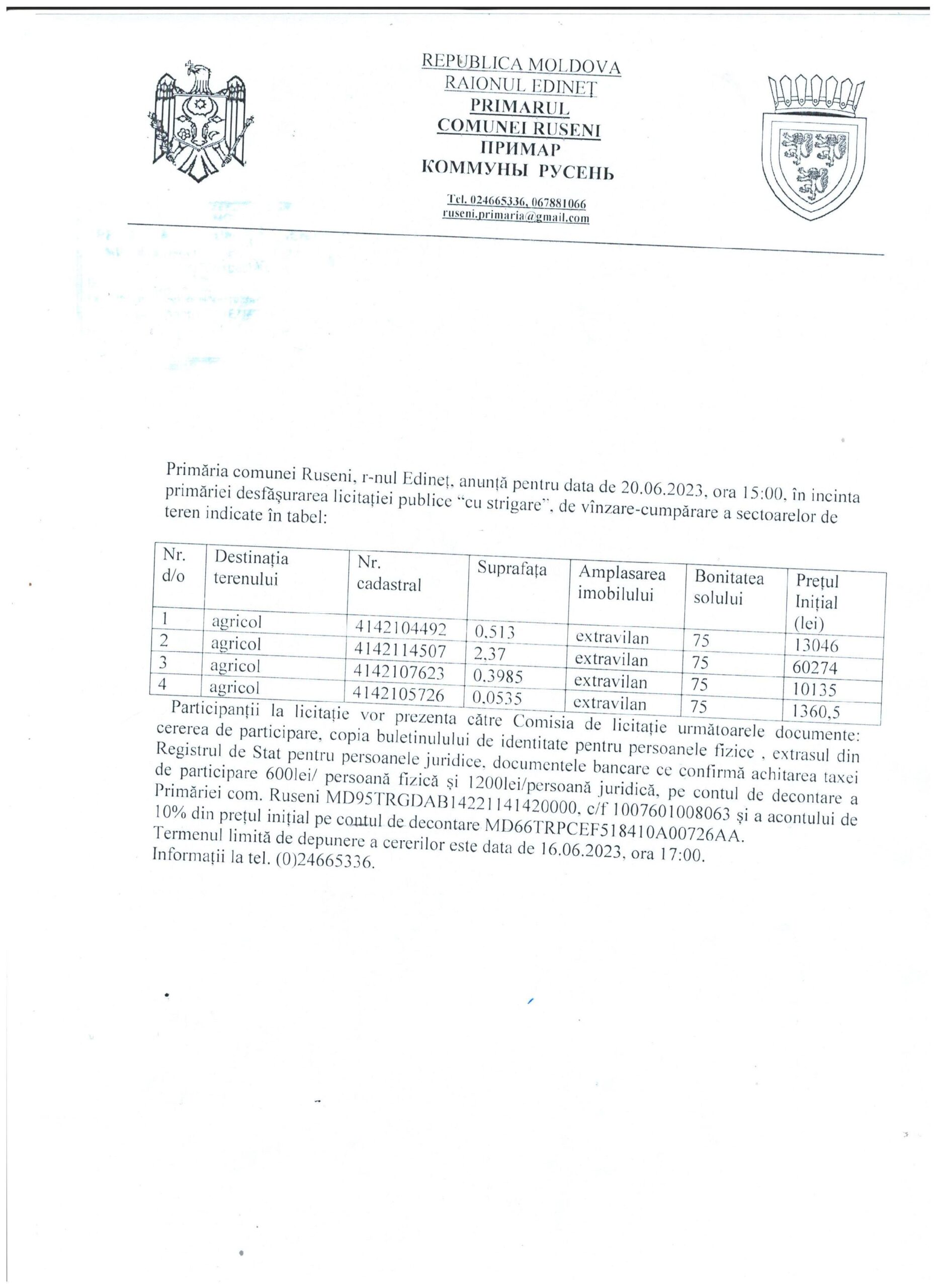 Primăria comunei Ruseni, r-nul Edineț, anunță pentru data de 20.06.2023, ora 15:00, în incinta primăriei desfășurarea licitației publice “cu strigare”, de vînzare-cumpărare a sectoarelor de teren indicate în fisierul atașat mai jos.